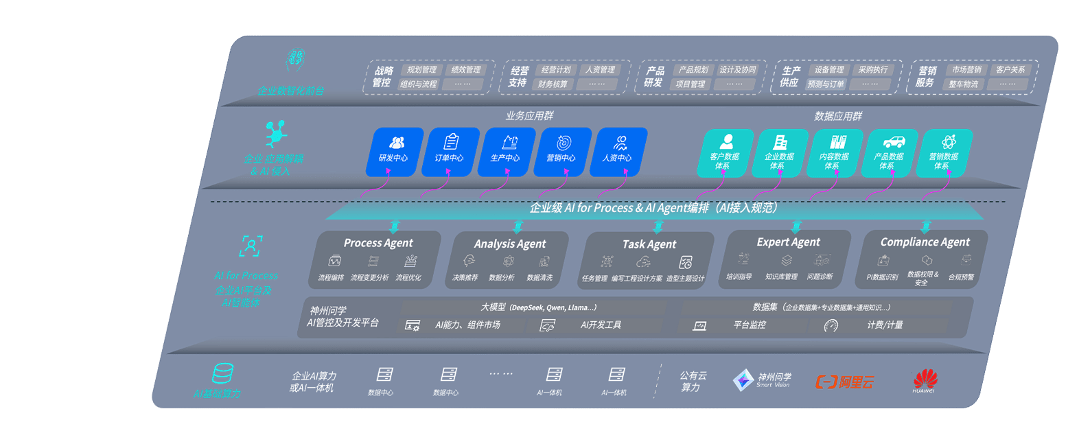 端到端的一站式AI工作空间深度融合了从企业战略规划到日常经营的全流程业务板块,,,定向解决车企内部领域多、、部门多、、、、链条长、、、场景碎片化等难题,,,支持车企快速构建以AI为核心的生产力写作体系,,实现任务执行与AI能力的无缝集成与交互