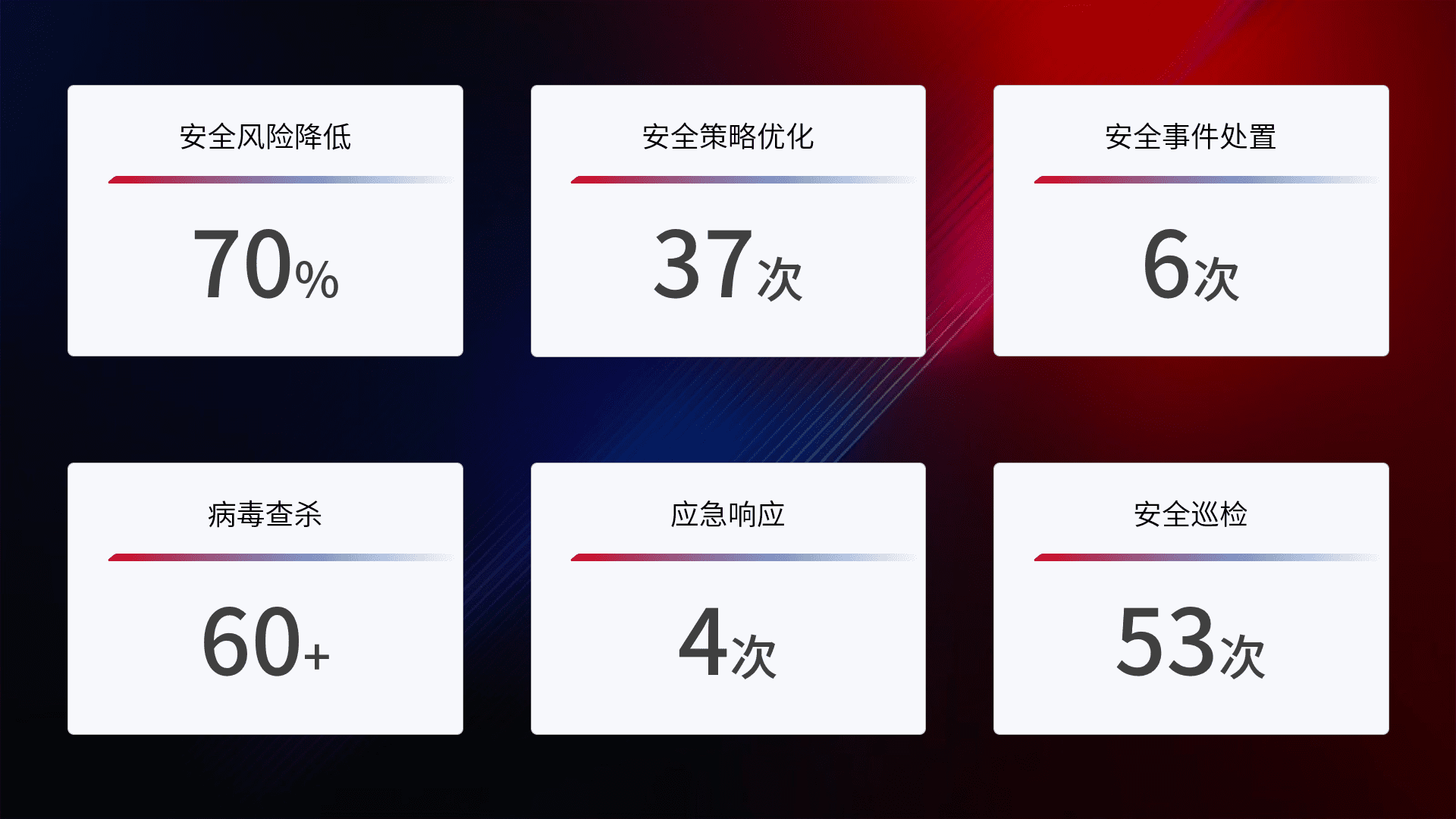 提供全面的安全事件报告体系,,,包括处置报告、、、周报、、、、季度和年度总结,,,结合持续监控,,,帮助客户深入了解网络安全状况。。