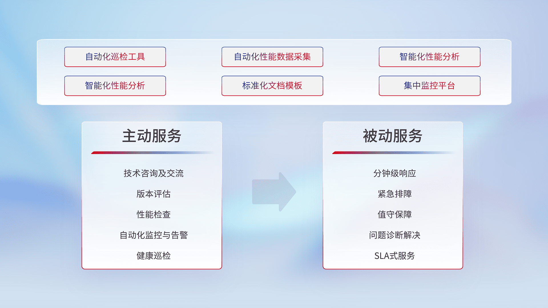 智能化工具和标准化文档,,,保障服务质量,,,提供主动服务(包含技术咨询、、、、版本评估、、性能检查、、、、自动化监控与告警、、健康巡检)和被动服务包含(分钟级响应、、、、紧急排障、、、值守保障、、问题诊断解决、、、、SLA服务)。。。。